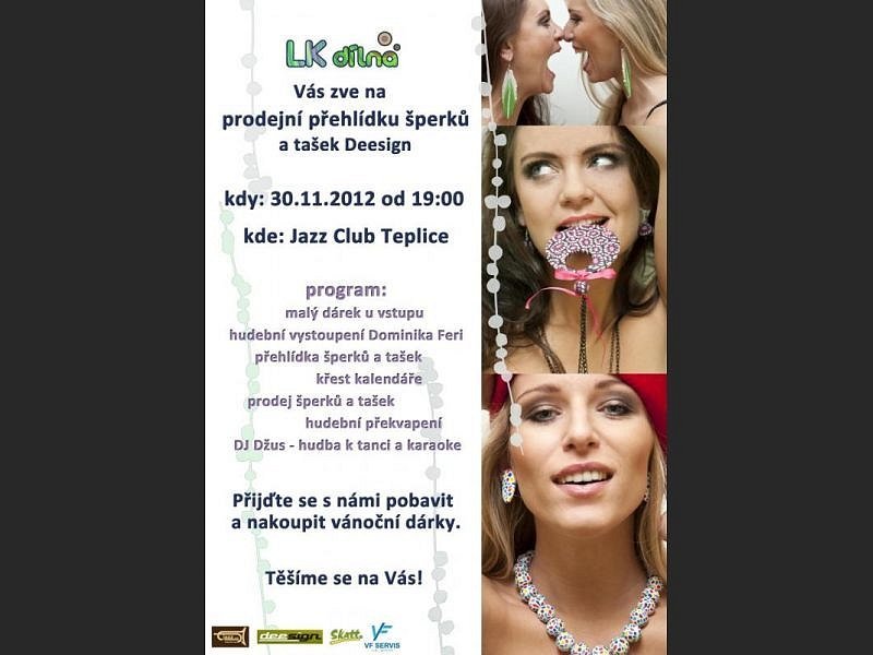 Dne 30.11.2012 se uskuteční prodejní přehlídka šperků LKdílny a tašek Deesign. Na přehlídce proběhne i křest kalendáře. Dále je na pořadu vystoupení Dominika Feri. Všechny Vás srdečně zveme.