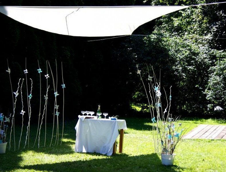 Dekorace jsou vyrobeny z nejrůznějších materiálů od živých květin po dekorace z organzy, různých stuh, papíru a dalších. Pro místo obřadu jsou často využívány stromky v květináčích vyrobené z větví a ozdobené různým způsobem. Tato dekorace je levná a efektní. Často je využíván břečťan, kterým jsou pokryté větší dekorace. Naší snahou je dekorovat místo svatebního obřadu efektně, kreativně a za rozumnou cenu. Proto využíváme i materiály, které najdeme v přírodě nebo recyklujeme jinde získané materiály.